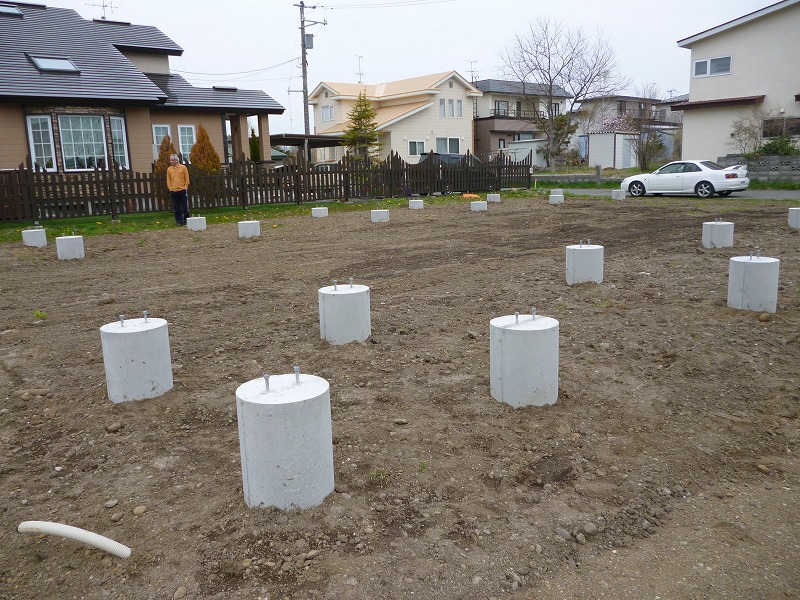 まず、基礎工事です。 今回は見た目にも良い円柱の基礎コンクリートを採用