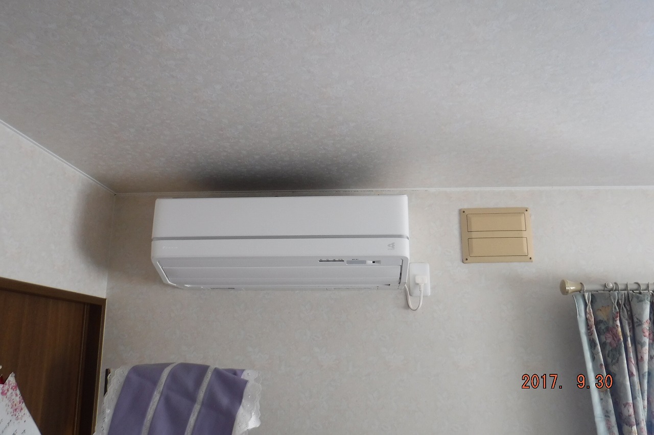寝室の既設のエアコンを移設し、新しくエアコンを設置しました。